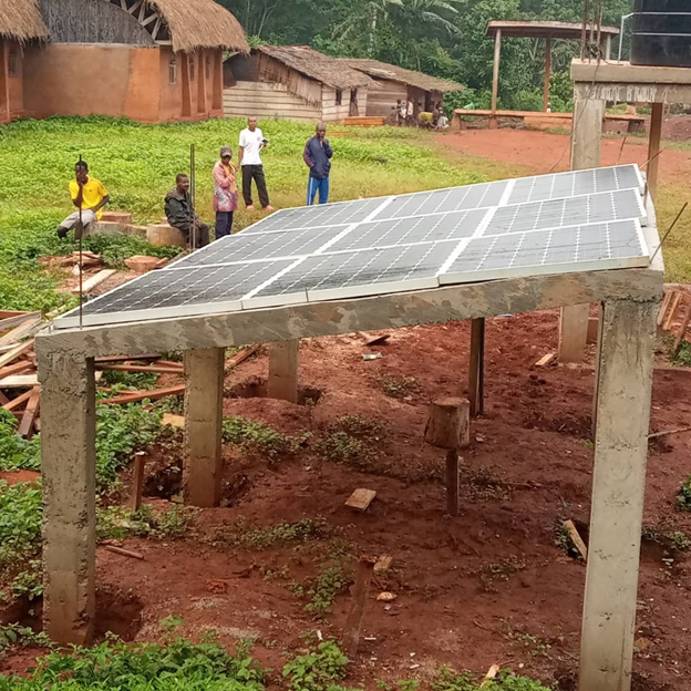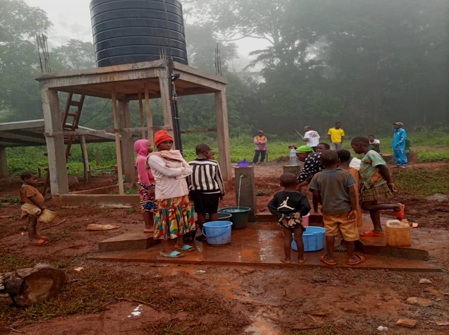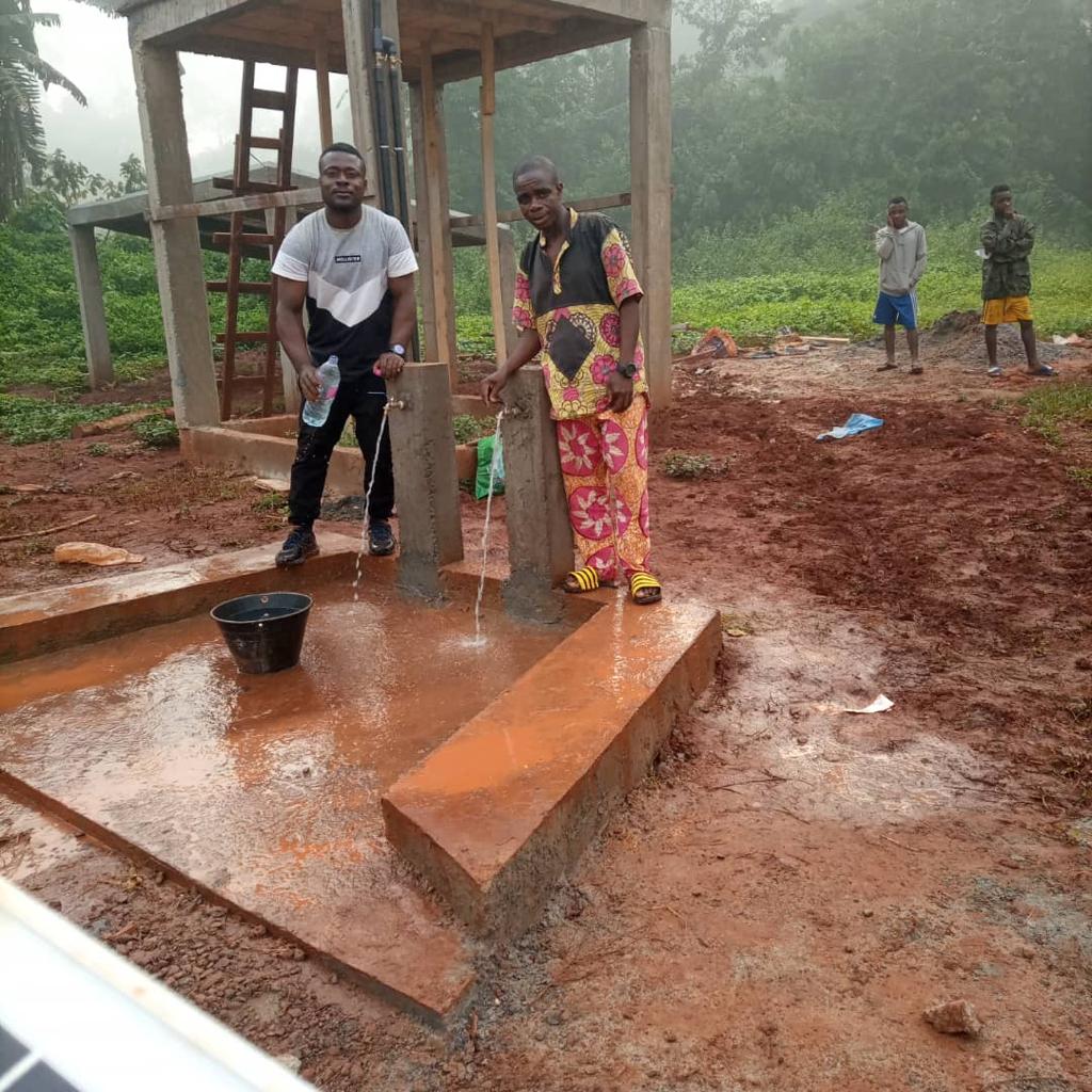 Community drawing clean water from a solar-powered borehole in Bifalon.